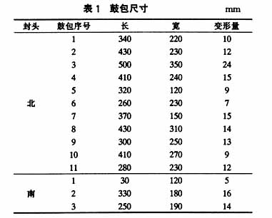 對(duì)北封頭,拆除保溫層進(jìn)行了檢查,面積較大且突出量較大的有11處;對(duì)南封頭3個(gè)明顯的鼓包進(jìn)行了測(cè)量,具體尺寸見表1。