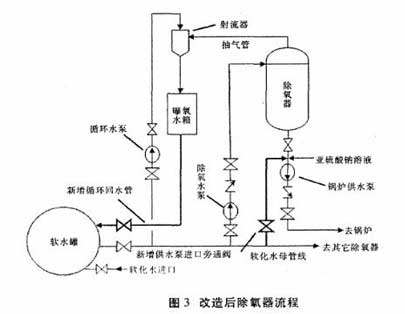 改造后的流程如圖3,粗實(shí)線為新增部分。 3.4供水泵旁通流程改造 供水泵旁通管線直接連接在軟化水母管線上,不再經(jīng)過(guò)脫氧泵,這樣改后操作簡(jiǎn)便,沿程阻力損失減少,在投入真空除氧器旁通流程時(shí),1臺(tái)泵就可以供應(yīng)4臺(tái)鍋爐的用水量。4改進(jìn)效果通過(guò)對(duì)給水除氧系統(tǒng)的技術(shù)改造,真空除氧器運(yùn)行工況良好,除氧效果明顯提高,改造后試運(yùn)行,真空除氧器真空穩(wěn)定在-0.095MPa以上,給水溶解氧已降低至300μg/L以下,運(yùn)行穩(wěn)定,合格率達(dá)100%,既簡(jiǎn)化操作減輕員工勞動(dòng)強(qiáng)度,又為穩(wěn)定運(yùn)行提供了保障。 此外,經(jīng)濟(jì)效益顯著。節(jié)約了20m3循環(huán)水溫升高時(shí)吸收的熱量約251.2×104kJ.按一天更換3罐水計(jì),少消耗電能,2093kW·h折合年少付電費(fèi)58.1×104元;年少耗水2.19×104m3,折全年少付水費(fèi)3.53×104元,以上全年年節(jié)省費(fèi)用61.63×104元。 |